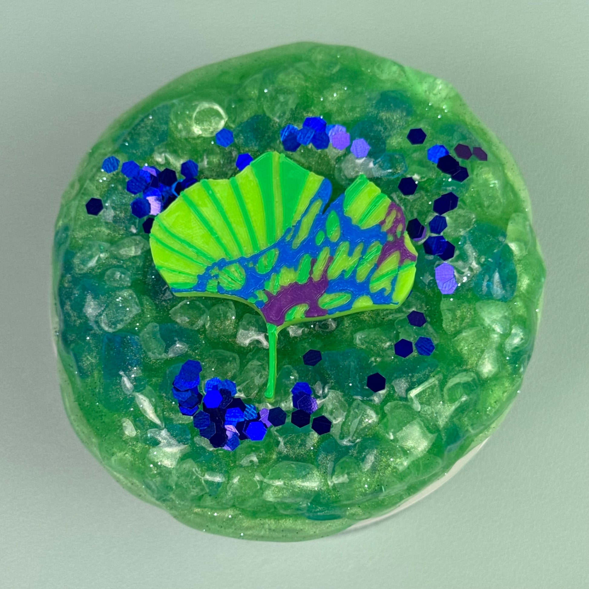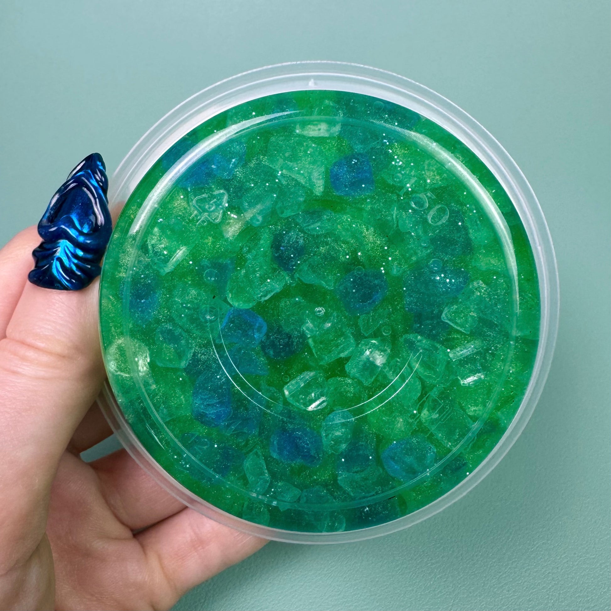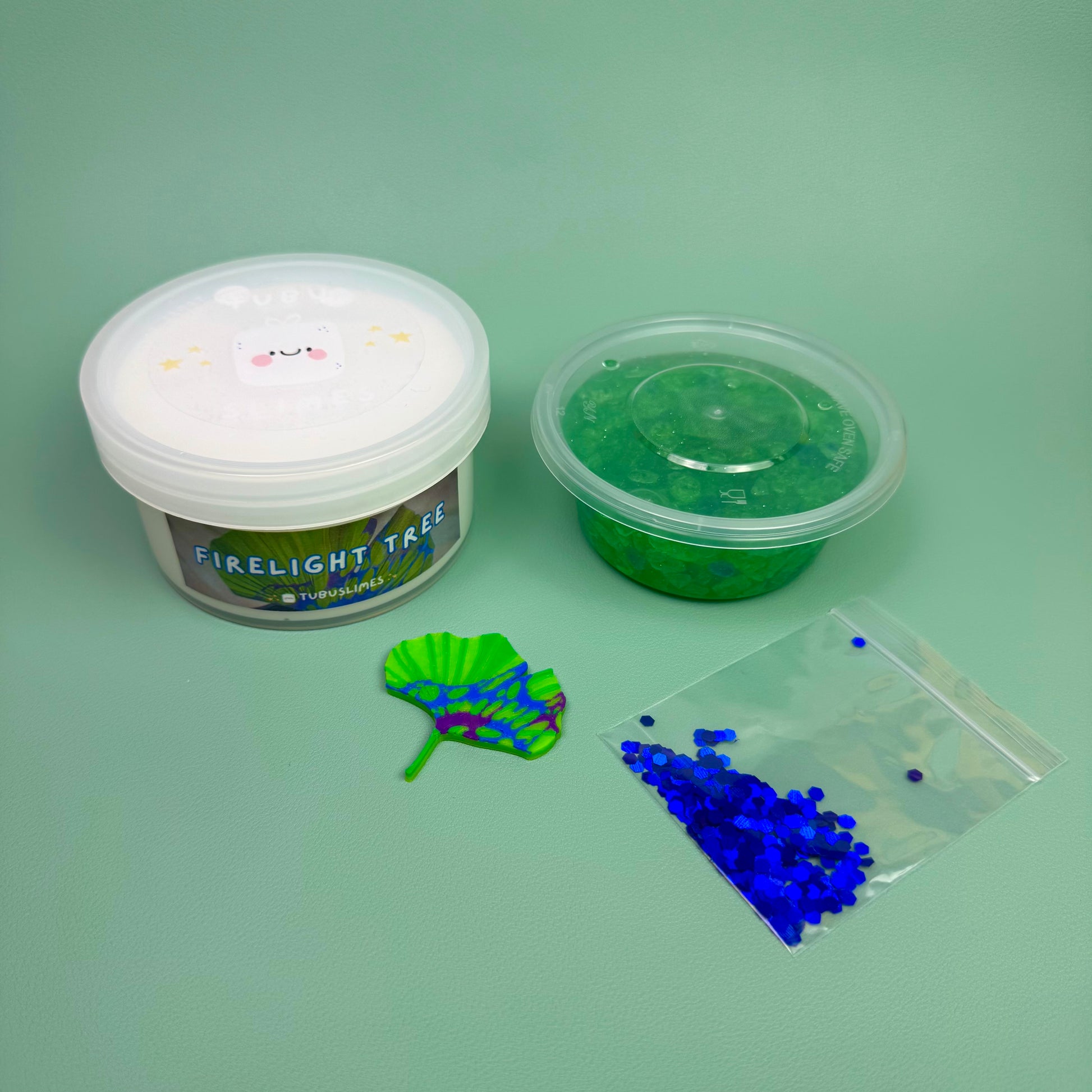 Texture: This plush, butter slime is topped with the most sparkly green slime mixed with light green and blue silica sand. Inspired by the Firelight Tree in Arcane, this slime is great for introducing soft hands into some rougher textures. Top with a custom ginkgo leaf charm and join the Firelights!