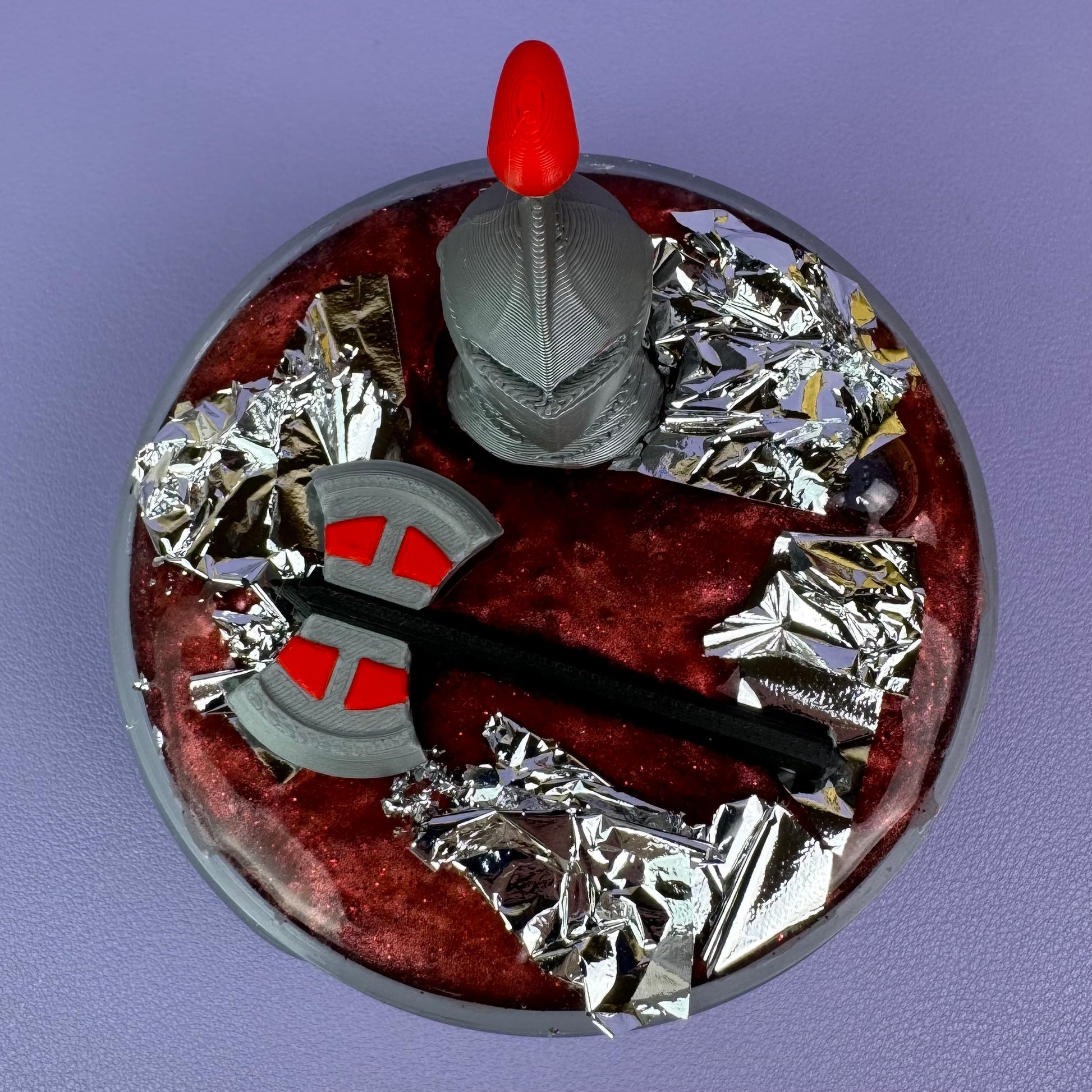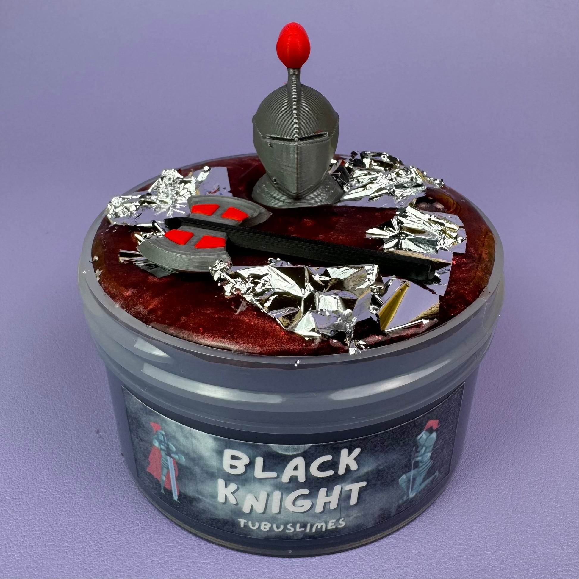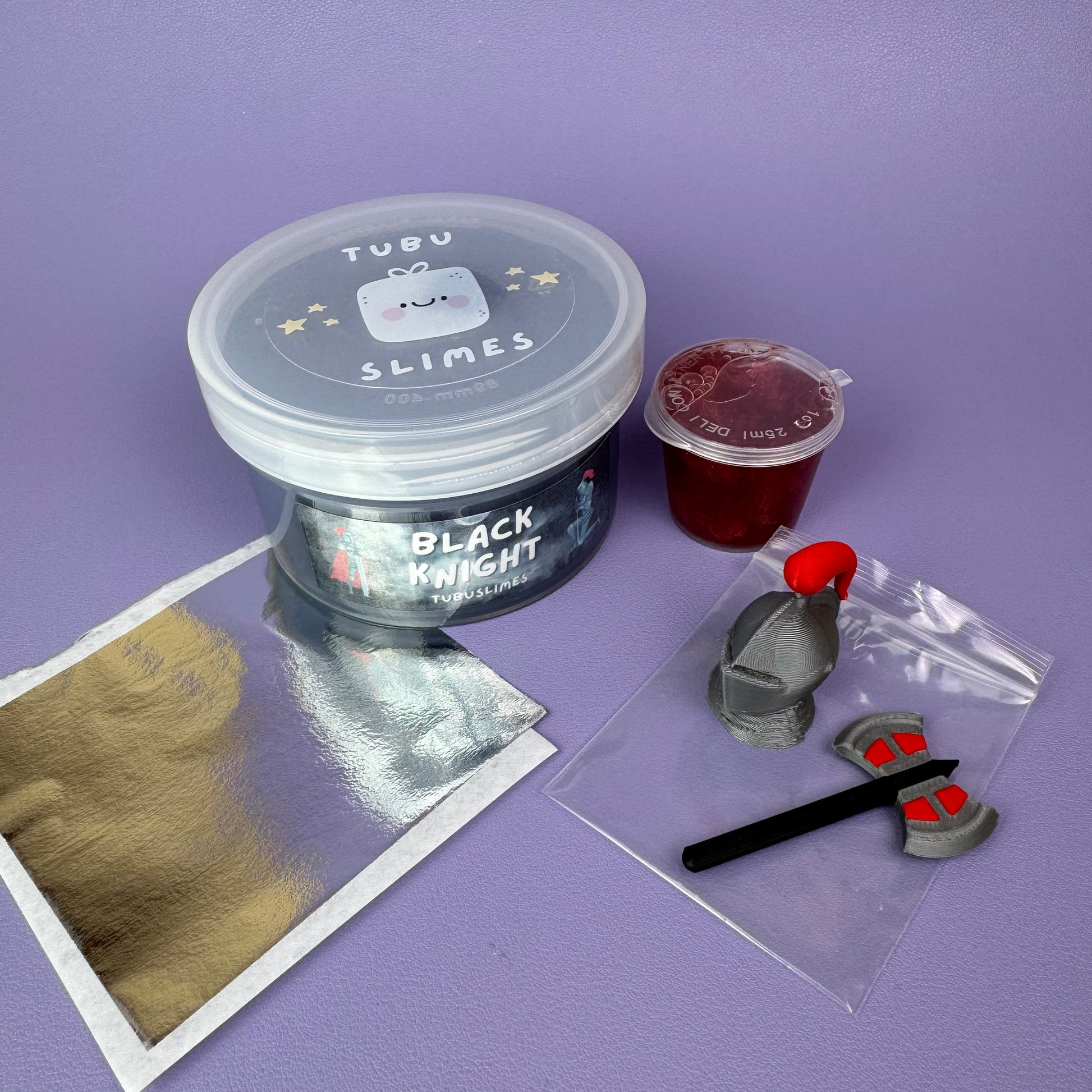 Texture: Channel your inner haunting monster with The Black Knight butter slime! The smooth, grey butter base is topped with a clear slime infused with shimmering red mica and glitter. Add silver foil for a spooky flair. Featuring custom knight helmet and battle axe charms, this holdable slime is perfect for beginners ready for a thrilling adventure!